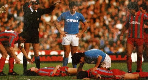 Era il 25 novembre 1984 (data che 36 anni dopo sarebbe diventata funesta per tutti i tifosi del Napoli e degli amanti del calcio con la morte di Diego), si giocava un Napoli-Cremonese in Serie A dopo quasi 55 anni, la gara era valida per la decima giornata di quel campionato. Gli azzurri, nonostante l'arrivo del più grande di tutti i tempi il 5 luglio 1984, non partirono bene e infatti prima di questo match erano incredibilmente quartultimi a quota 7, mentre gli ospiti erano addirittura ultimi con soli 3 punti. La gara vide subito il Napoli molto aggressivo, con un Maradona in stato di grazia, che passò in vantaggio al 27° grazie ad una serie di passaggi che liberarono Carannante sulla sinistra, il quale mise al centro un cross preciso per Bertoni che, staccandosi dalla stretta marcatura avversaria, segnò un gol bellissimo in rovesciata che non lasciò scampo al portiere Borin. Il Napoli poi subì la reazione avversaria, ma riuscì a portare a casa i due punti, anche soffrendo. Ma in quel match accadde anche un episodio che avrebbe potuto rivelarsi molto grave: al 49° minuto si scontrarono accidentalmente di testa i due calciatori della Cremonese Mario Montorfano e Sergio Paolinelli, i quali restarono esanimi a terra e, i calciatori in campo e anche Maradona, fecero ampi gesti per far sì che lo staff medico si sincerasse subito delle loro condizioni. Per fortuna i due grigiorossi se la cavarono, ma in quel momento se la videro davvero brutta.