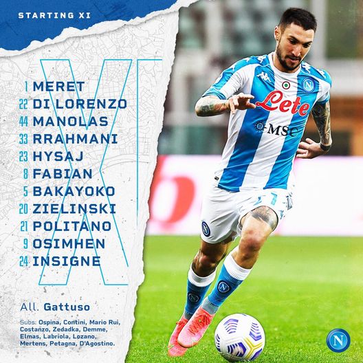 Napoli (4-2-3-1): Meret; Di Lorenzo, Manolas, Rrahmani, Hysaj; Fabian Ruiz, Bakayoko; Politano, Zielinski, Insigne; Osimhen. All.: Gattuso