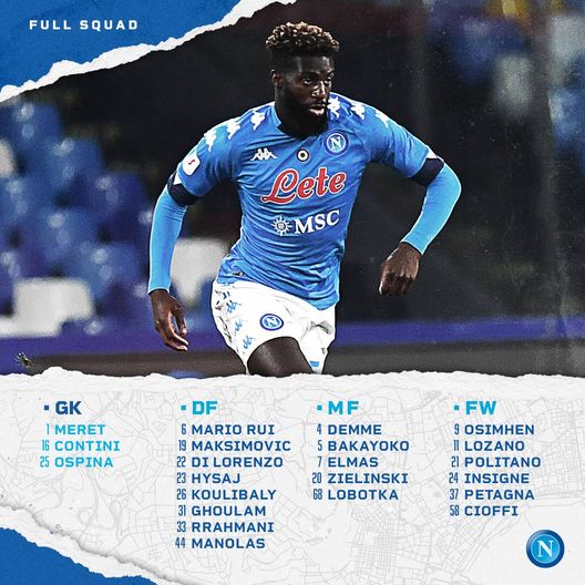 Meret, Ospina, Contini, Di Lorenzo, Ghoulam, Hysaj, Koulibaly, Maksimovic, Manolas, Rrahmani, Mario Rui, Demme, Elmas, Lobotka, Zielinski, Bakayoko, Lozano, Osimhen, Petagna, Politano, Insigne, Cioffi.